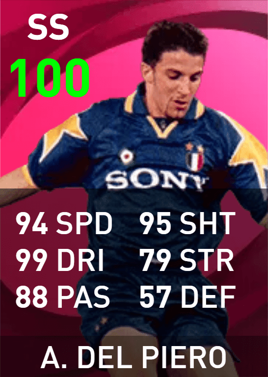 Para penyuka sepak bola Italia pasti sudah tidak asing dengan pemain yang satu ini. Alessandro Del Piero atau lebih sering dipanggil Del Piero adalah seorang pemain berkebangsaan Italia yang terkenal akan kelihaiannya dalam melakukan dribble dan tendangan bebas. Terbukti, di PES 2021 ia mendapatkan Iconic Moment dengan rating 92 dan maksimal 100 (club boost), rating dribbling 99, balance 99, ball control 99, tight possession 98, place kicking 97, dan curl 98. Dengan rating seperti ini, membuatnya sangat mematikan apabila dipasang sebagai seorang pemain yang menjadi eksekutor tendangan bebas.